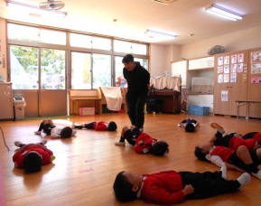 「かみなりゲーム」をしました。先生の掛け声に合わせて仰向けになったり、うつ伏せになったり・・先生の声を集中して聞き上手にできました。
