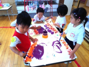 10月に掘ってきた「さつまいも」を使って芋スタンプにしたり、絵の具で思い思いに さつまいも を描きました。収穫した芋の形や数を思い出しながら楽しそうに絵を描く姿が見られました。
