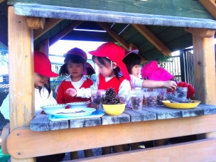 遊びの中で落ち葉やどんぐり、松ぼっくりなど秋の自然物を使って、「どんぐり転がし」や「おままごと」を楽しんでいます。