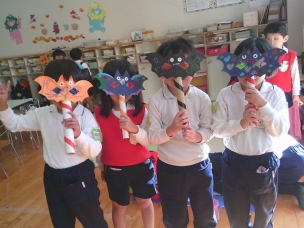 ハロウィンが近づき子どもたちは手持ちの”コウモリの仮面”を作りました。完成すると「年長さんに見せてくる」「年少さん、ひよこさんを驚かせていいかな?」と連日、コウモリ仮面を手に持ち園内を徘徊。当日は”どんぐりキャンディ”をかぼちゃの容器に入れ「お菓子をくれなきゃ いたずらしちゃうぞ!」を合言葉にお互いのクラスで楽しく配り合っていました。