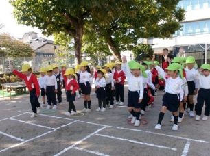 園庭で、横断歩道では信号が青になったら手を上げ「よく(右)見て(左)渡る(右)」の言葉に合わせ左右の確認をしながら渡ること。 ”止まれ”の標識を見つけた時は「止まって 待って 飛び出さない」と止まること。の2つの場面を実際に引いた白線の上で練習しました。