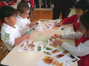 11月の食育指導では、「主食・主菜・副菜」を3:2:1のバランスのいいお弁当を作ってみよう。と、子どもたちは印刷された食品をハサミで切り「○○好きなんだー」と友達と知らせ合いながら楽しくオリジナルお弁当を完成させました。