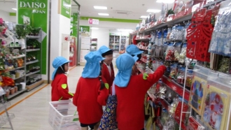 表町商店街にあるダイソーへお買い物に行きました。買い物に行く前に「幼稚園のみんなで楽しく遊べるものを買いたい」と声があがり、どんな物が喜んでもらえるか自分たちなりに考えながら一所懸命選んでいました。園に帰って購入した品物を見せ合ったり、自分たちで遊んだり、他の学年のみんなにあげたりすることに期待を膨らませていました。