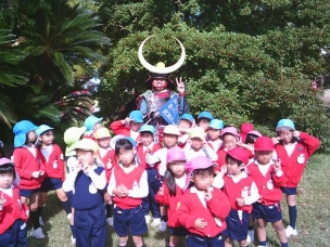きれいな菊を見た後は、烏城公園まであがり、広場で自然物を拾ったり走ったりと異年齢のお友達と一緒にのびのびと遊びました。そこへ、大きな兜をかぶった武士の方から声をかけられて子どもたちは大興奮!!!