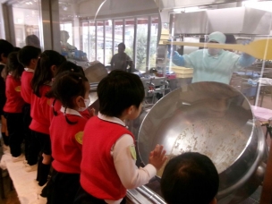 いつも食べている給食を作っているところを見ることが出来ると、ワクワクな様子の子どもたち。
