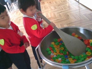 クラスごとに分かれて見学と体験をしました。厨房見学では、大きな鍋で給食が作られていて「すごーい!!!」と目が釘付けになっていました。道具体験では、お家でよく見る器具よりも、何倍も大きなザルやしゃもじを見て驚く子供たち。お鍋やザルに入っている ままごとの野菜を使って、かき混ぜたり水切りを体験しました。