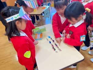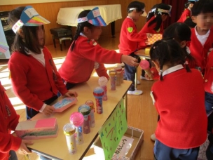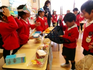 年長組は年中さんと店員役を交代して待ちに待ったお買い物です。まっしぐらにお店へ向かい人気の商品は大行列。買った商品はクラスで友達と見せ合ったり身に付けたりして嬉しそうにしていました。